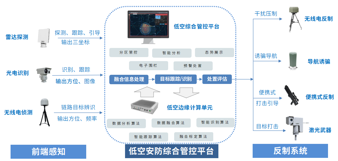 慧爾視“天羅3號”系統(tǒng)構(gòu)建“遠、中、近”三層防御體系,并實現(xiàn)多元感知和多元打擊閉環(huán)方案。